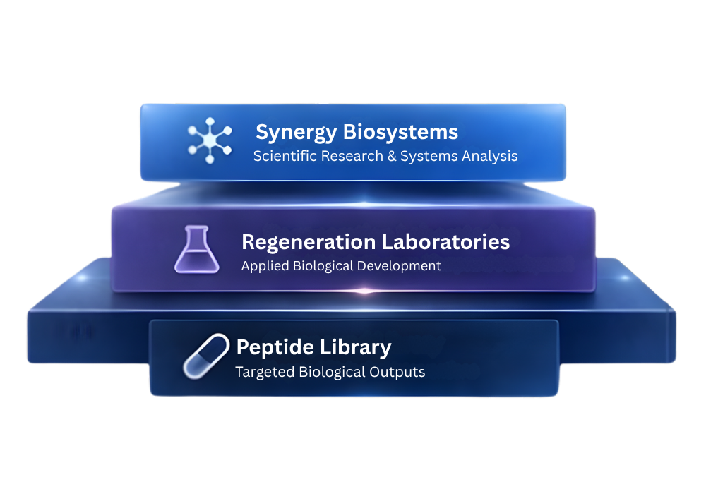 Synergy Biosystems provides the scientific and systems-based foundation behind Regeneration Laboratories. Through Synergy, biological pathways, system interactions, and broader research architecture are studied at platform level, while Regeneration Laboratories applies that work to the development of targeted peptides and therapeutic applications.